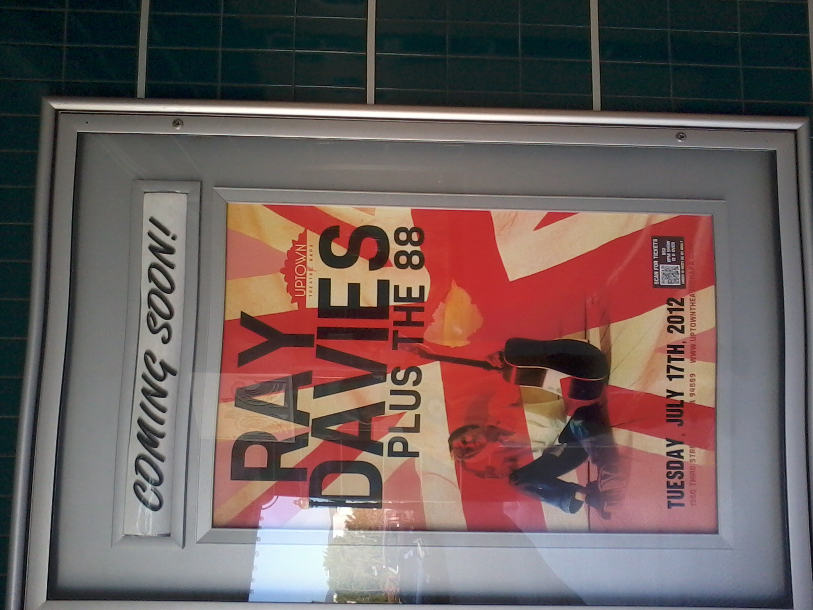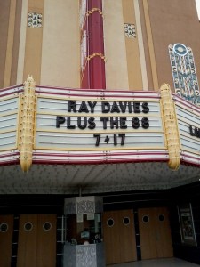I drove into Napa last Friday night from San Francisco and just fifty yards away from where I was staying was the Uptown theater with Ray Davies advertised for Tuesday the 17th.  Didn’t know if I’d make it–had a lot of wine yet to drink and a lot of wineries yet to visit–but go I did.  And I was glad. The opening band The 88 were very good–the front man reminded me a lot of Larry Kirwan from Black 47–and later they acted as Ray Davies back-up band for the second half of Davies’ set.