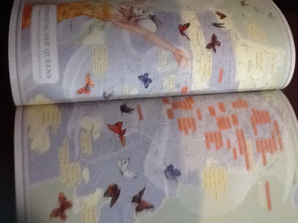 But it is the pairings that are the most intriguing. One map, entitled Death and Beauty,  tracks the murders in the city during the year 2008 and the locations of Monterey cyprus trees throughout the city; another entitled Dharma Wheels and Fish Ladders lists salmon streams, hatcheries and viewing sites along with the location of Zen monasteries, schools, and core sites; and still another, entitled Monarchs and Queens, reveals the locations of various butterfly locations and queer public spaces.