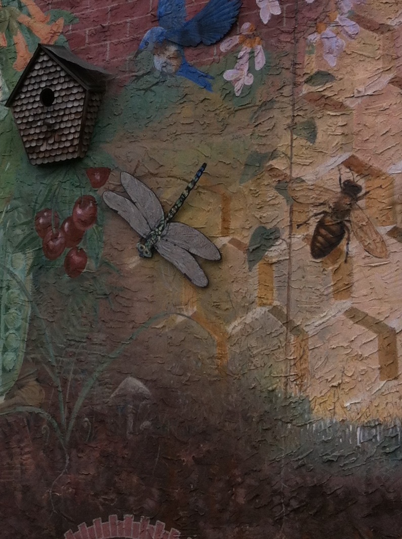 A half-block north of the Ortleib’s brewery is Liberty Lands Park. Its southern wall is Kaplan’s Bakery and the air is filled with the aroma of baking bread–bread that makes its way to many of the restaurants throughout the city. The wall is filled with a three-dimensional mural of birds and bees and a map of the land as it once was.