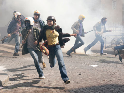 But for Gilles, Alain, Christine, Rachkam la Rouge, they want very much for the  spirit of May 1968 to be carried on, to be carried through.  They believe that May was not the climax but the beginning of the revolution. Stuck in their sleepy village outside of Paris, the students join political parties, pack debating halls, distribute the radical free-press, and organize guerrilla graffiti forays against the local establishment and police.  One of these night raids goes wrong and a guard falls into a coma when hit with a bag of cement mix.  The students decide to scatter.