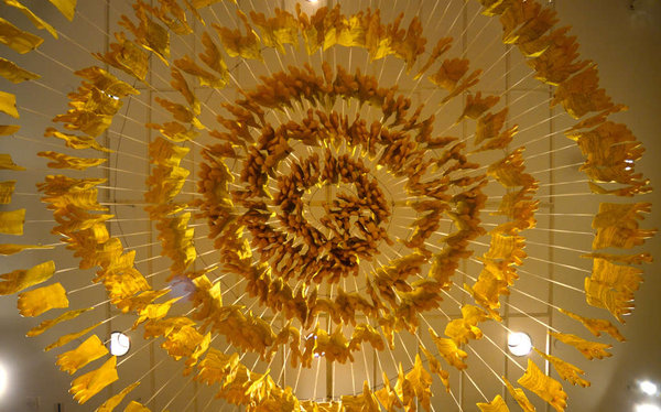 The artist, Jessica Deane Rosner, wrote out the entire text of the novel on 310 yellow, rubber, dish gloves and suspended them from the gallery ceiling in a very Joycean spiral. Rosner stated that it was Joyce who showed us that the things of everyday life–including the muck and the un-pretty–are the very essence of and inspiration for Art.